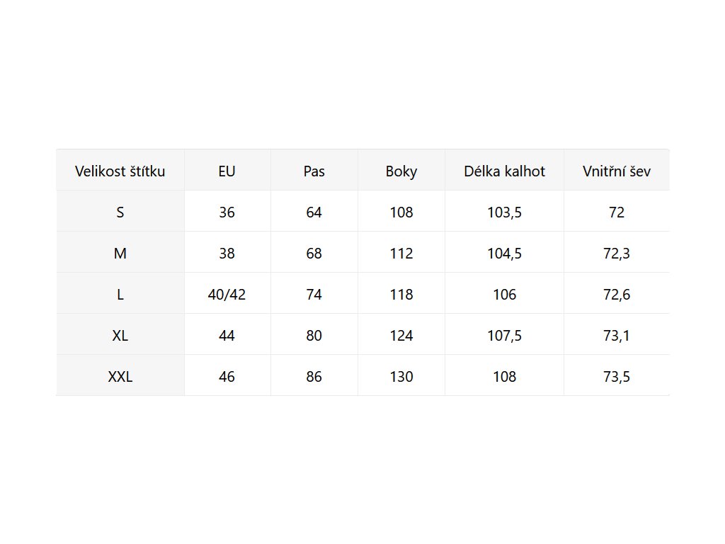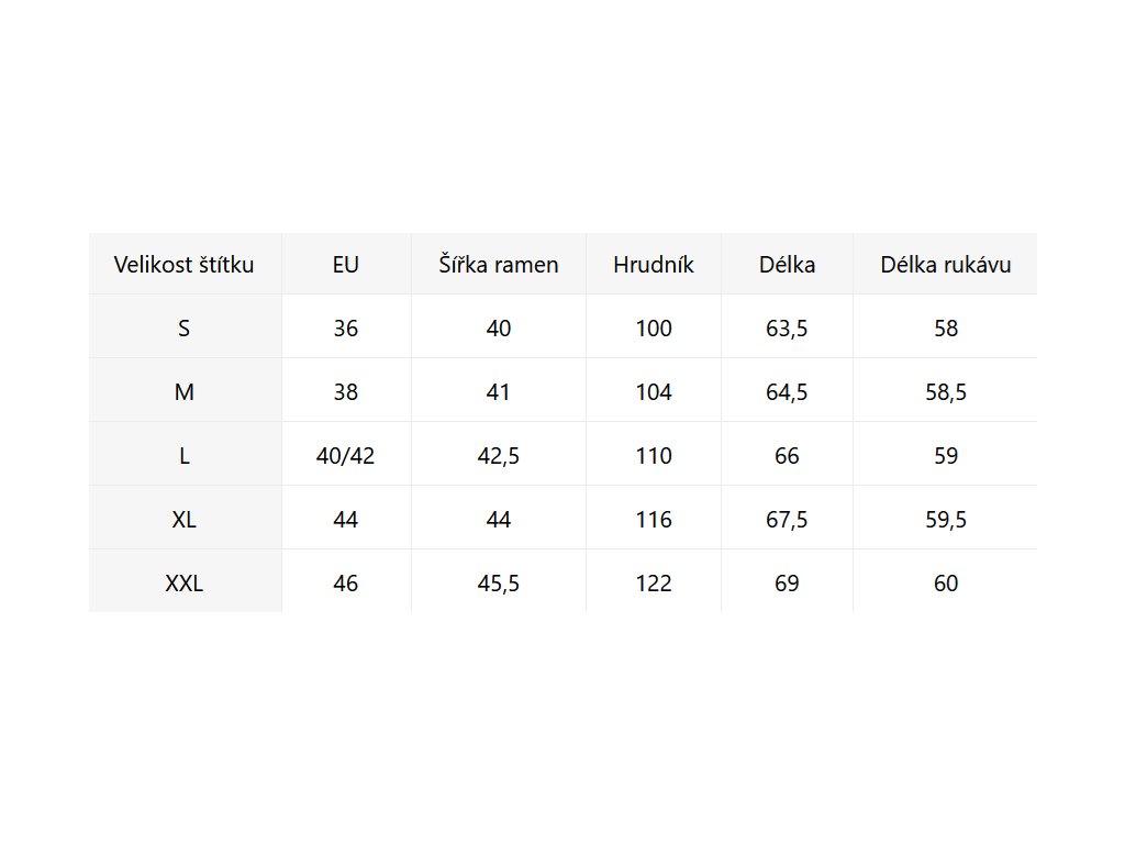 • Velikostní tabulka u fotek produktu