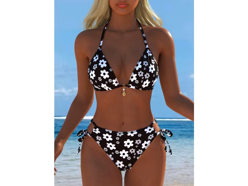 Dámské dvoudílné černobílé plavky s kytičkama