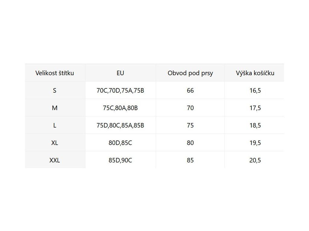 Vršek: Vyztužené košíčky se zavazováním za krkem a na zádech, které poskytují dobrou oporu a snadnou regulaci obvodu.