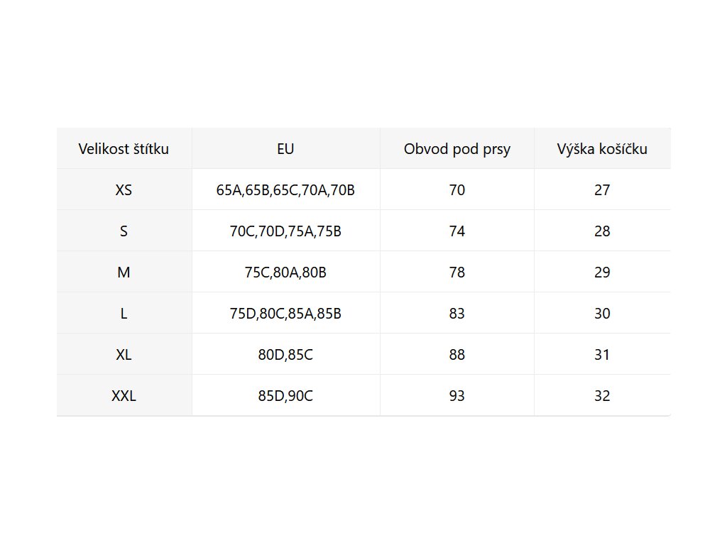 - Velikostní tabulka u fotek produktu