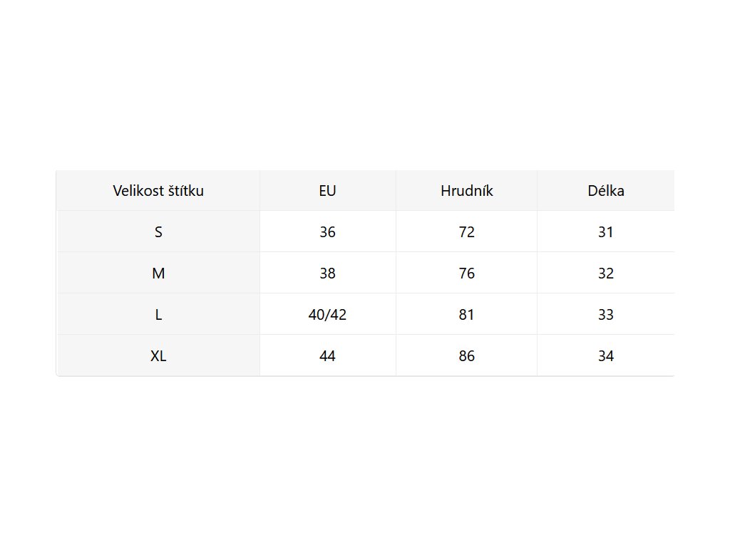 - Velikostní tabulka u fotek produktu
