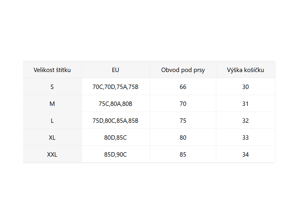- Velikostní tabulka u fotek produktu