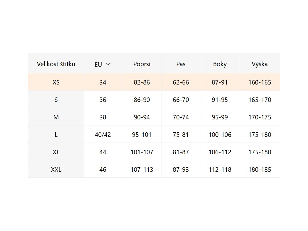 - Velikostní tabulka u fotek produktu