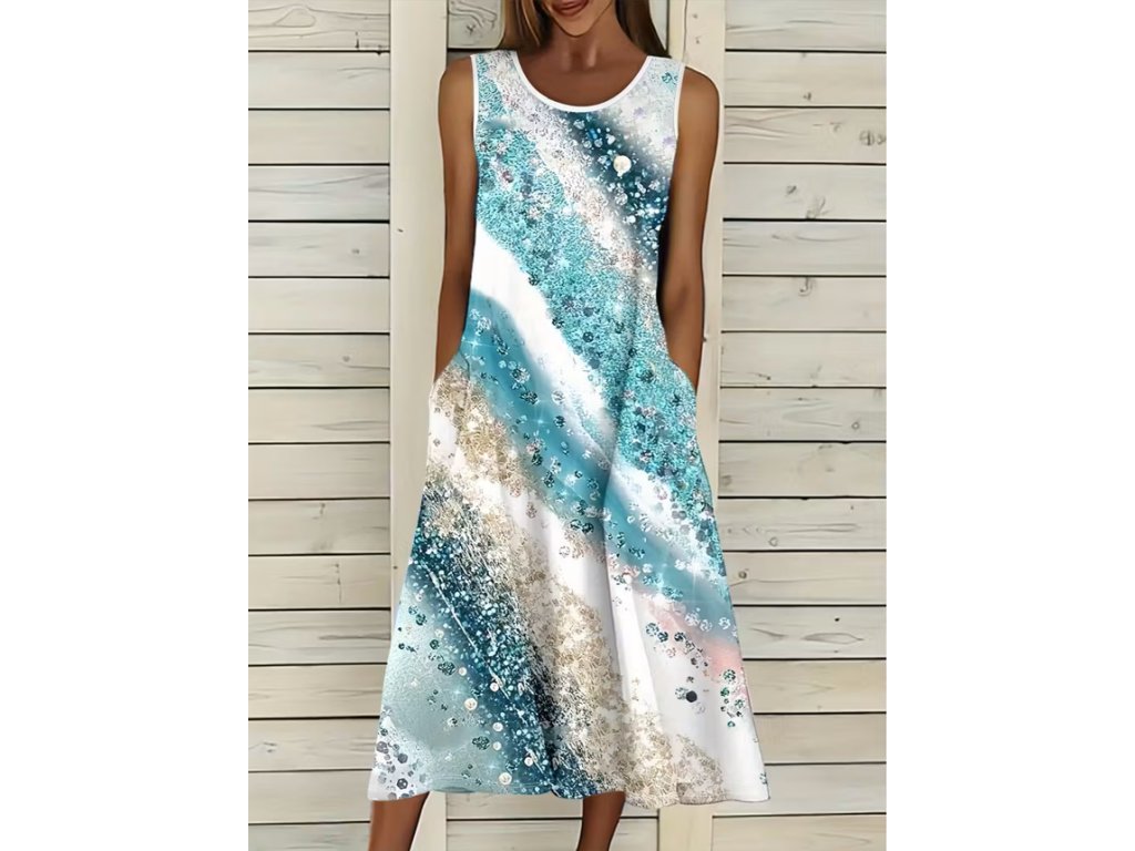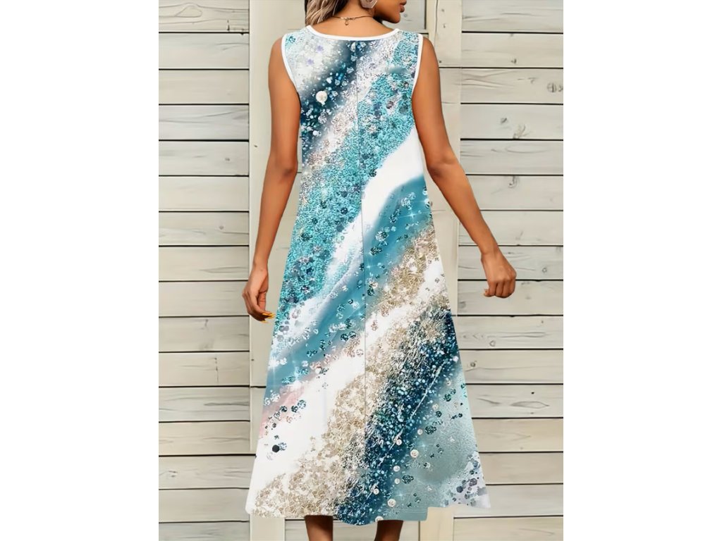 Dlouhé letní šaty ve vlnách tyrkysové a bílé barvě
