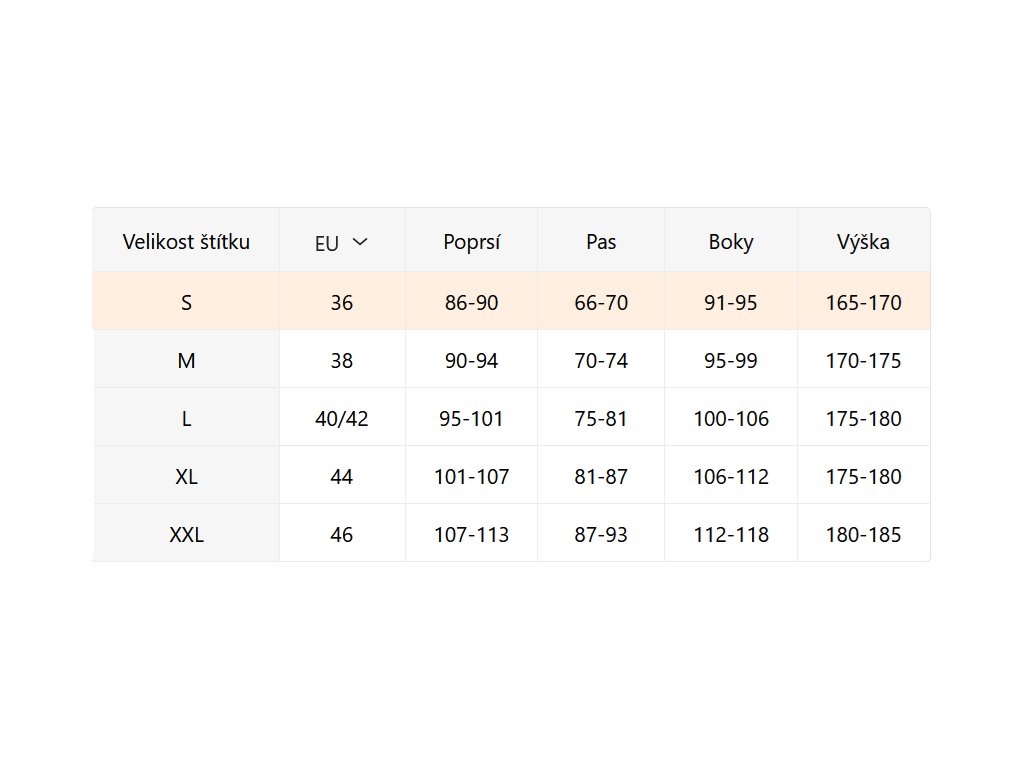 - Velikostní tabulka u fotek produktu