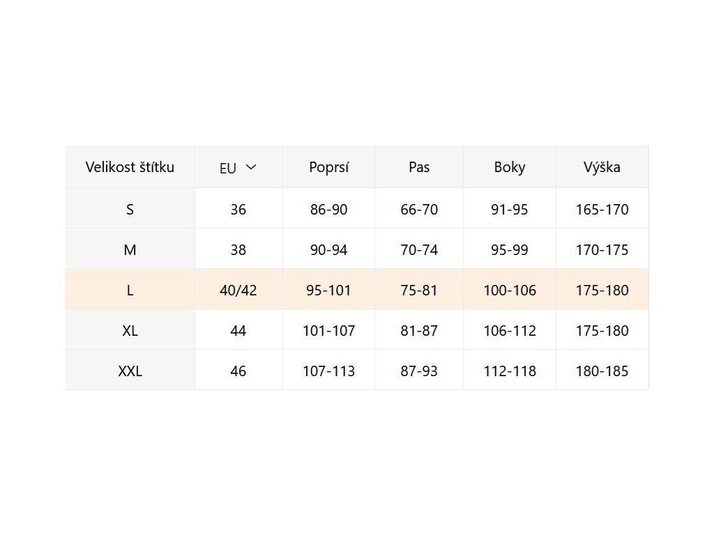 - Velikostní tabulka u fotek produktu